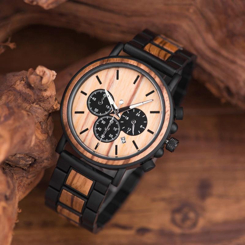 Un reloj de madera es ideal para la persona perspicaz que aprecia piezas únicas. Este reloj sigiloso de metal y madera seguramente llamará la atención mientras mantiene el registro preciso de tu tiempo. Cuenta con una banda ajustable de metal y madera que muestra su hermoso grano natural. El Cronómetro también incluye un cilindro de bambú hecho a mano para guardarlo de manera elegante.